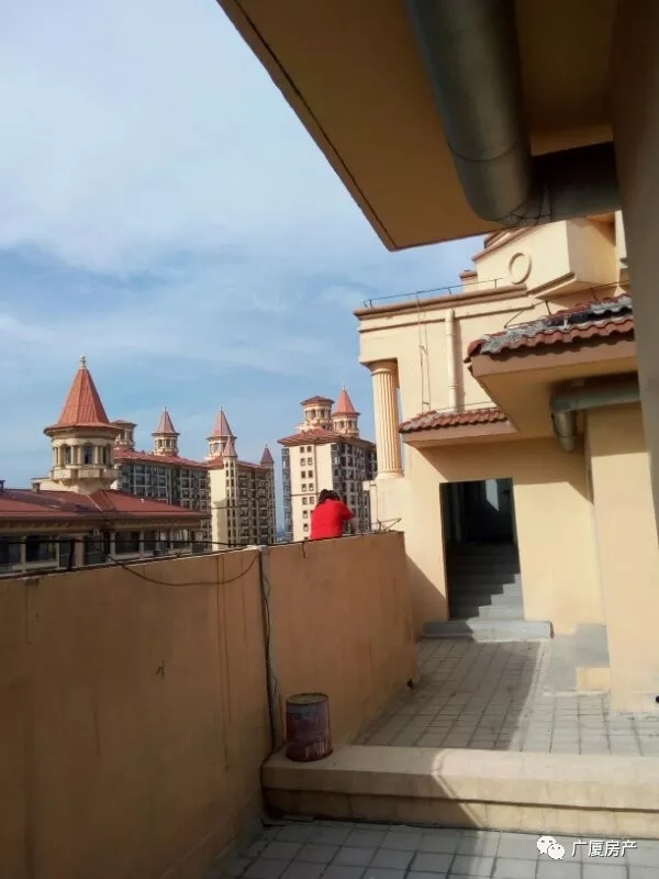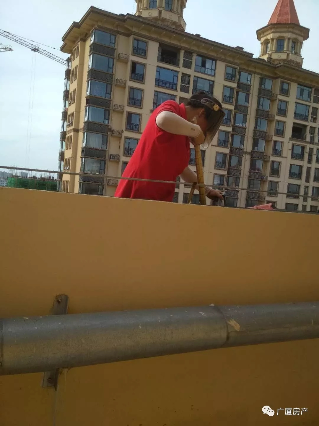 保潔員打掃樓房的天溝,樓房高大,她們的身影更高大。